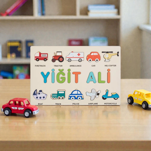 Montessori Ahşap İsme Özel Puzzle 10 Figür İngilizce Taşıtlar